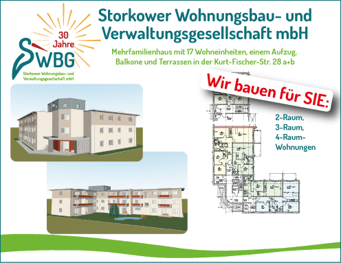 Am 28.07.2025 um 14:00 Uhr wurde der Grundstein für den ersten Neubau der Storkower Wohnungsbau- und Verwaltungsgesellschaft mbH seit über 25 Jahren gelegt. Es werden 17 attraktive Wohnungen mit modernen Grundrissen entstehen. Alle Wohnungen im Erdgeschoß werden über eine Terrasse verfügen, die Wohnungen in den beiden darüber liegenden Etagen haben jeweils einen Balkon. Das Haus ist zweigeteilt, in die Hausaufgänge Kurt-Fischer-Straße 28 a und b. In der Kurt-Fischer-Straße 28a wird es 12 Wohnungen geben, die neben dem Treppenhaus zusätzlich über einen Aufzug erreichbar sind. Insgesamt sind alle Wohnungen barrierearm geplant. Die Kurt-Fischer-Straße 28b ist etwas für Sportliche, hier werden 5 Wohnungen über ein Treppenhaus erreichbar sein.